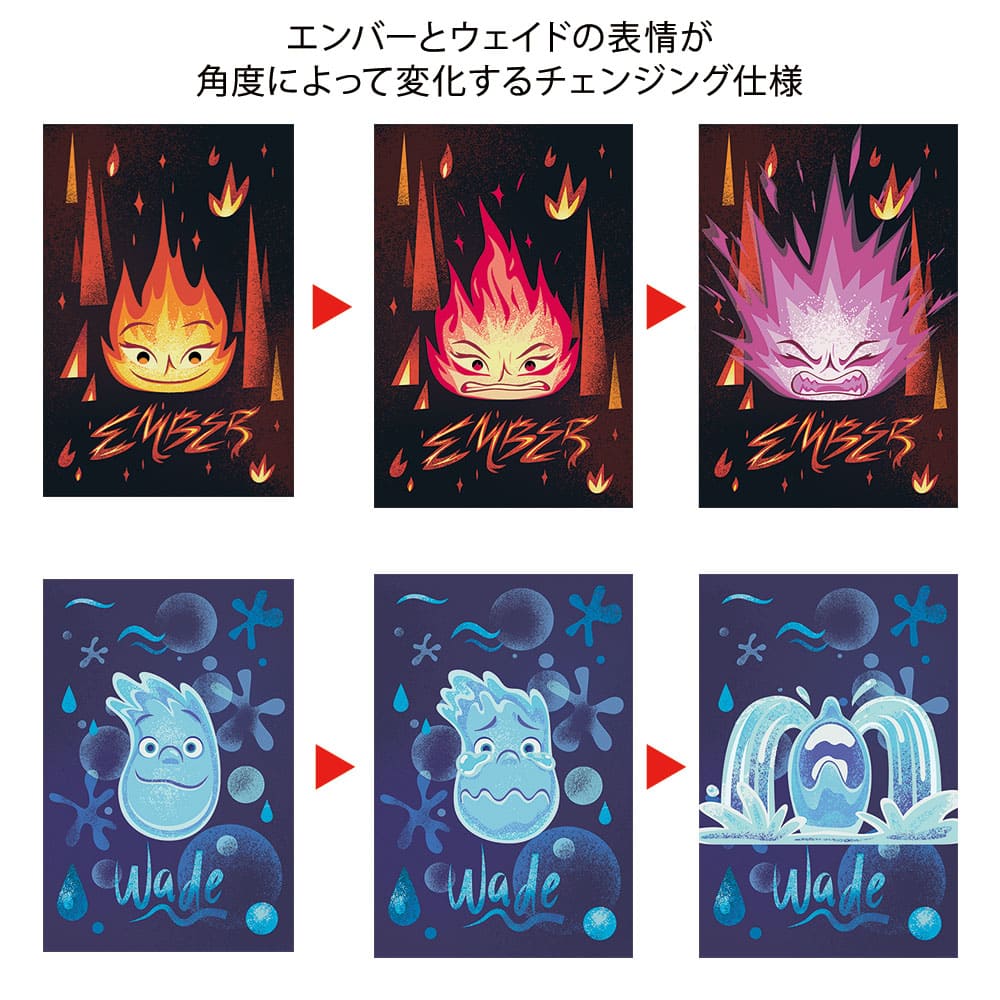ポスター風デザインや、4つのエレメントたちが集合しているデザインに加えて、エンバーとウェイドの表情が角度によって変化するチェンジング仕様のポストカードセットです♪