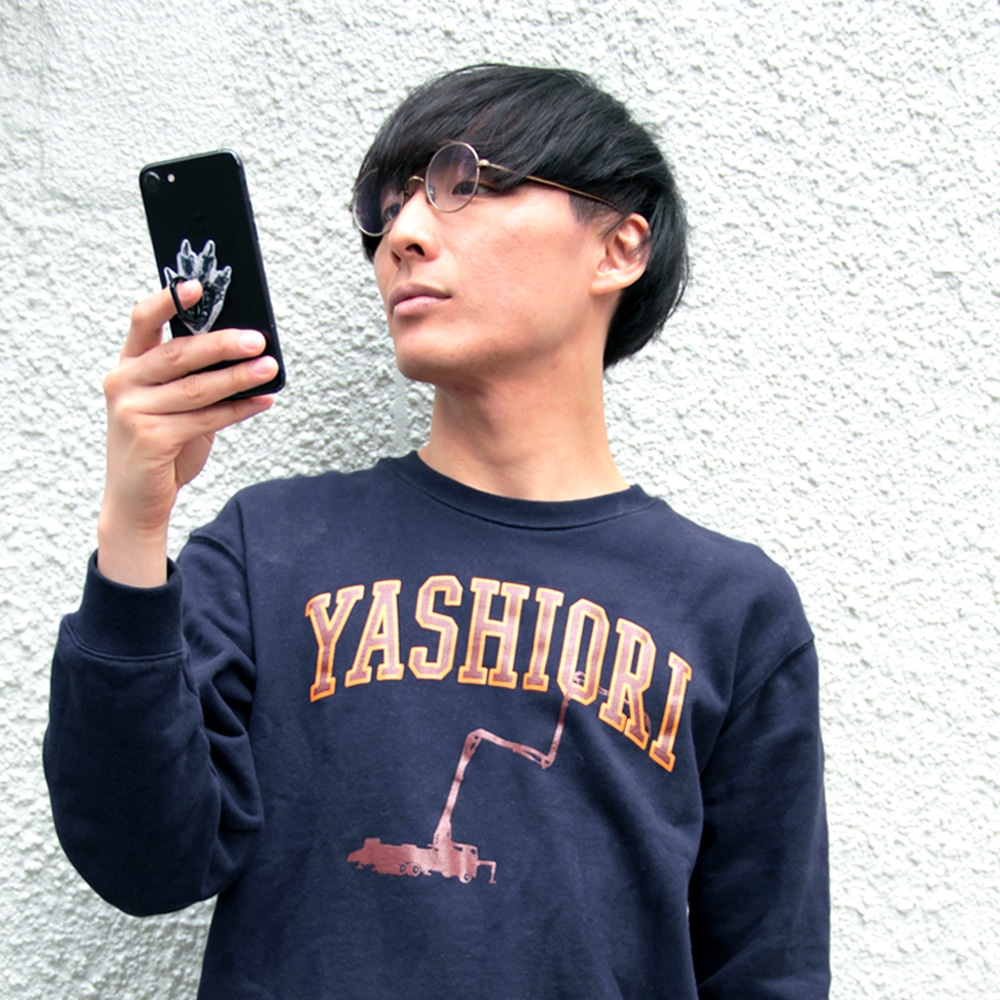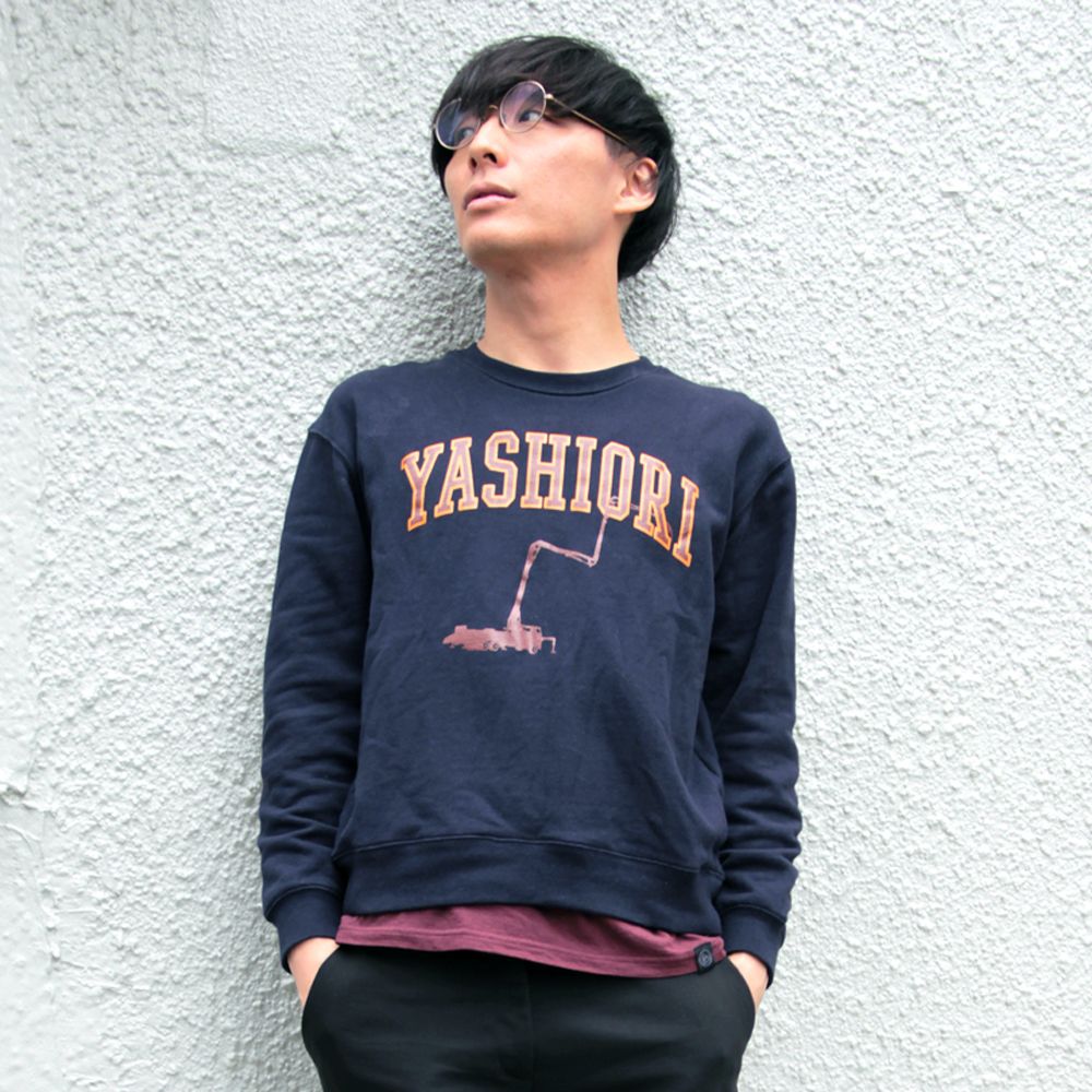 「YASHIORI」ロゴに高圧ポンプ車のシルエットをあしらったスタンダードなカレッジスウェットは“ゴジラ凍結成功後、矢口副長官が作戦に関わった隊員達に労いのノベルティとして配った”と云うイメージでデザインされました。