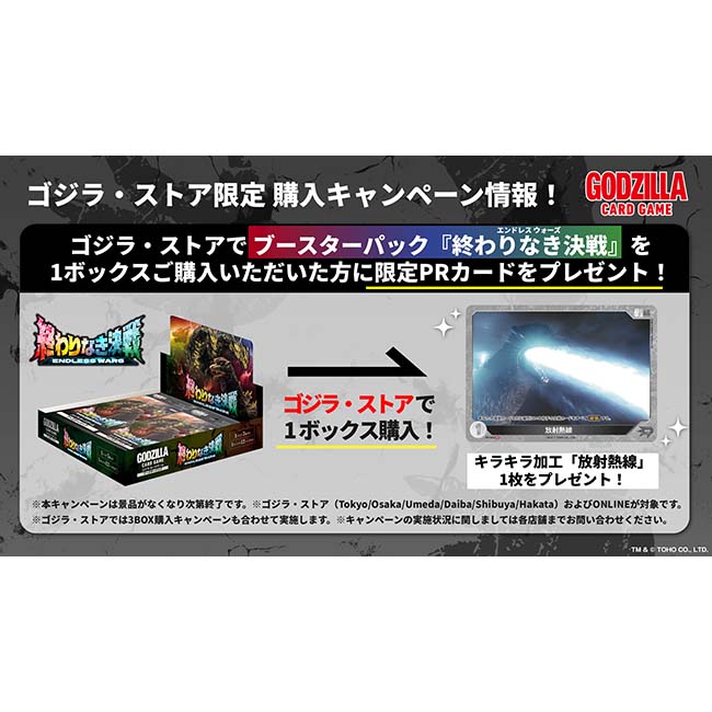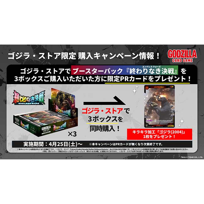 ブースターパック『終わりなき決戦(エンドレス ウォーズ)』を3ボックス購入で、キラキラ加工のゴジラ・ストア限定特典 限定PRカード「ゴジラ(2004)」をプレゼント!
