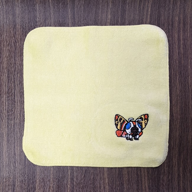 ミニハンドタオルにモスラをワンポイント刺繍!折りたたんでポケットに入る小さめサイズです!
