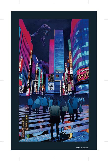 ホテルの奥、ネオンの照り返しで闇夜に薄っすら見えているゴジラに気づいた少女の図で、ホラー風な趣もあります。