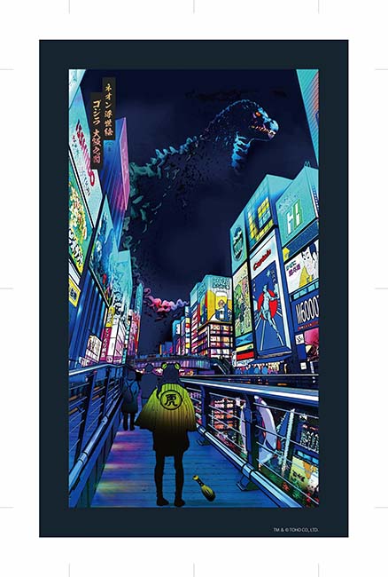 ネオン浮世絵「ゴジラ 新宿之図」と同様で、大阪=サイバーパンク(ネオン)風に仕上げています。