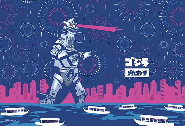 メカゴジラの鋼の煌めきと夜空に咲き誇る花火の華やかさが魅力的な作品。