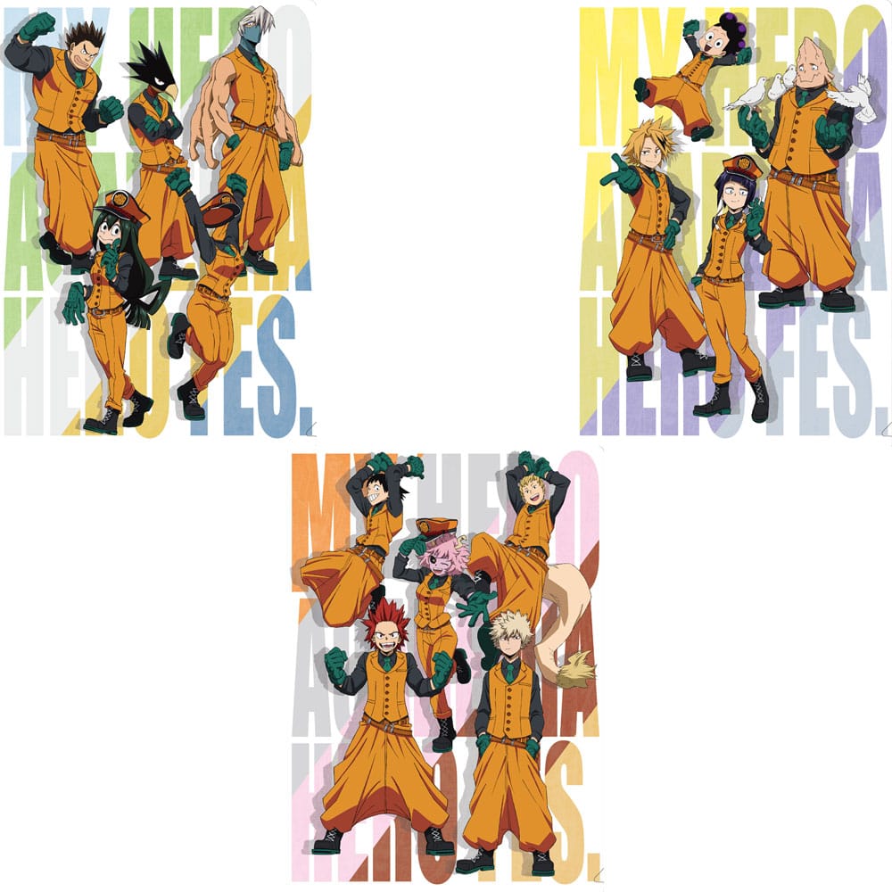 イベント用描き下ろしイラストを表面に、イベントロゴを裏面にそれぞれプリント。「爆豪勝己、切島鋭児郎、芦戸三奈、瀬呂範太、尾白猿夫」「峰田 実、上鳴電気、耳郎響香、口田甲司」「蛙吹梅雨、常闇踏陰、葉隠 透、砂藤力道」の3種類をセットにしてお届けいたします!