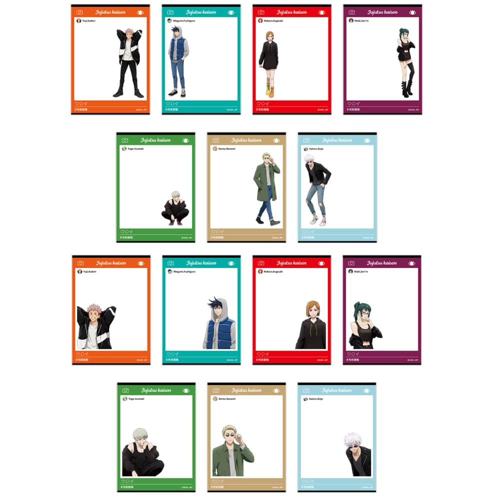 「虎杖悠仁、伏黒 恵、釘崎野薔薇、禪院真希、狗巻 棘、七海建人、五条 悟」がそれぞれ2種類ずつSNS風にデザインされたカード全14種類のうち、ランダム4個をセットにしてお届けします。