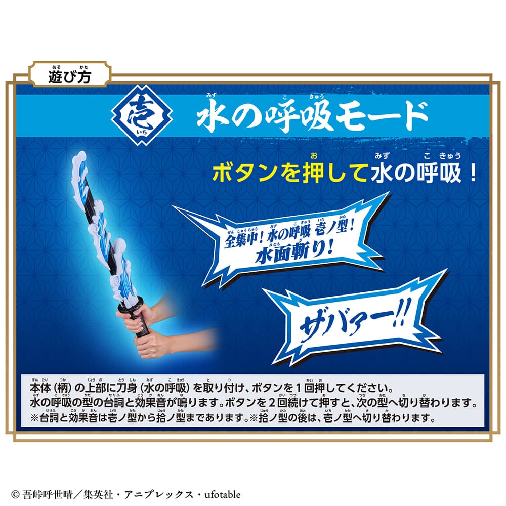 本体(柄)に刀身がついていると「水の呼吸モード」になり、ボタンを押して台詞と効果音を再生し、なりきり遊びが楽しめます。 刀身を外すと「アクションモード」になり、ボタンを押して台詞のあとに本体(柄)を振ると効果音を楽しむことができます。 また本体(柄)を振るたびに効果音が流れるので、より没入感のあるなりきり遊びが楽しめます。
