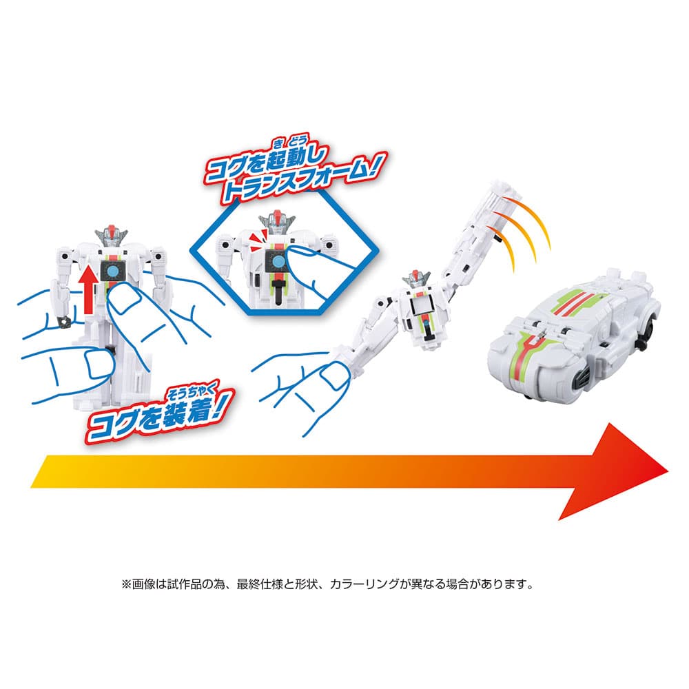 ロボットモードの胸にコグを装着&起動によって、ビークルモードへ瞬間変形!