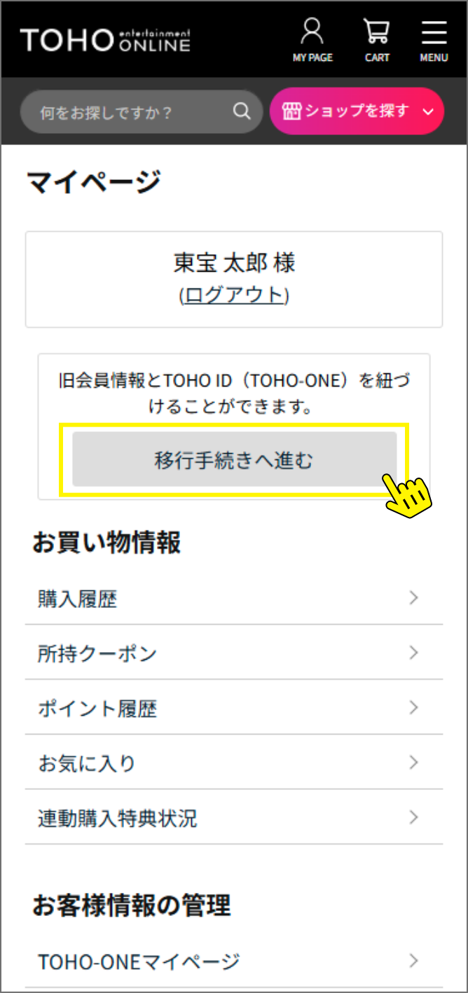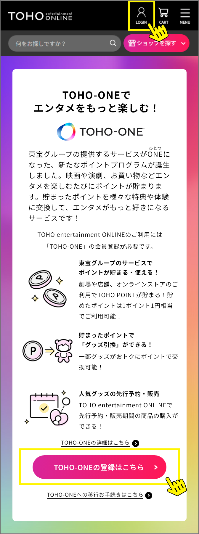 3月3日以降に、①TOHO-ONEへの新規会員登録、②TOHO-ONE会員情報とTOHO entertainment ONLINE会員情報の紐づけ(移行手続き)が必要となります。